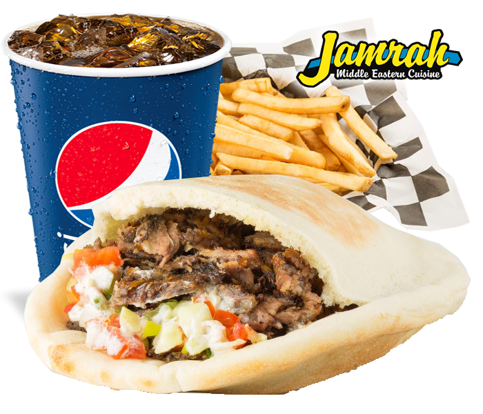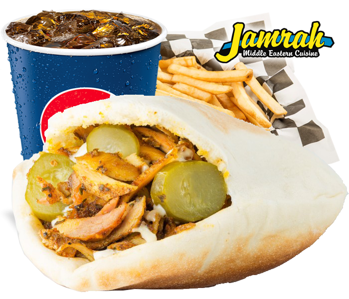includes a sandwich, fries includes Includes : Shish Kabob, Chicken Shawarma, Beef Shawarma & Falafel, all on a bed of Basmati Rice. Served with Jamrah Salad.and a drink