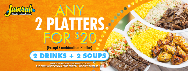 February is the shortest month of the year, but at Jamrah, our specials go a long way! we are offering your choice of two platters for ONLY $20! This includes your choice of two drinks and 2 soups with your delicious, platter choice! Just mention the ad when you come by and save. And as always, thank you from Jamrah! Please see our ad for more details.