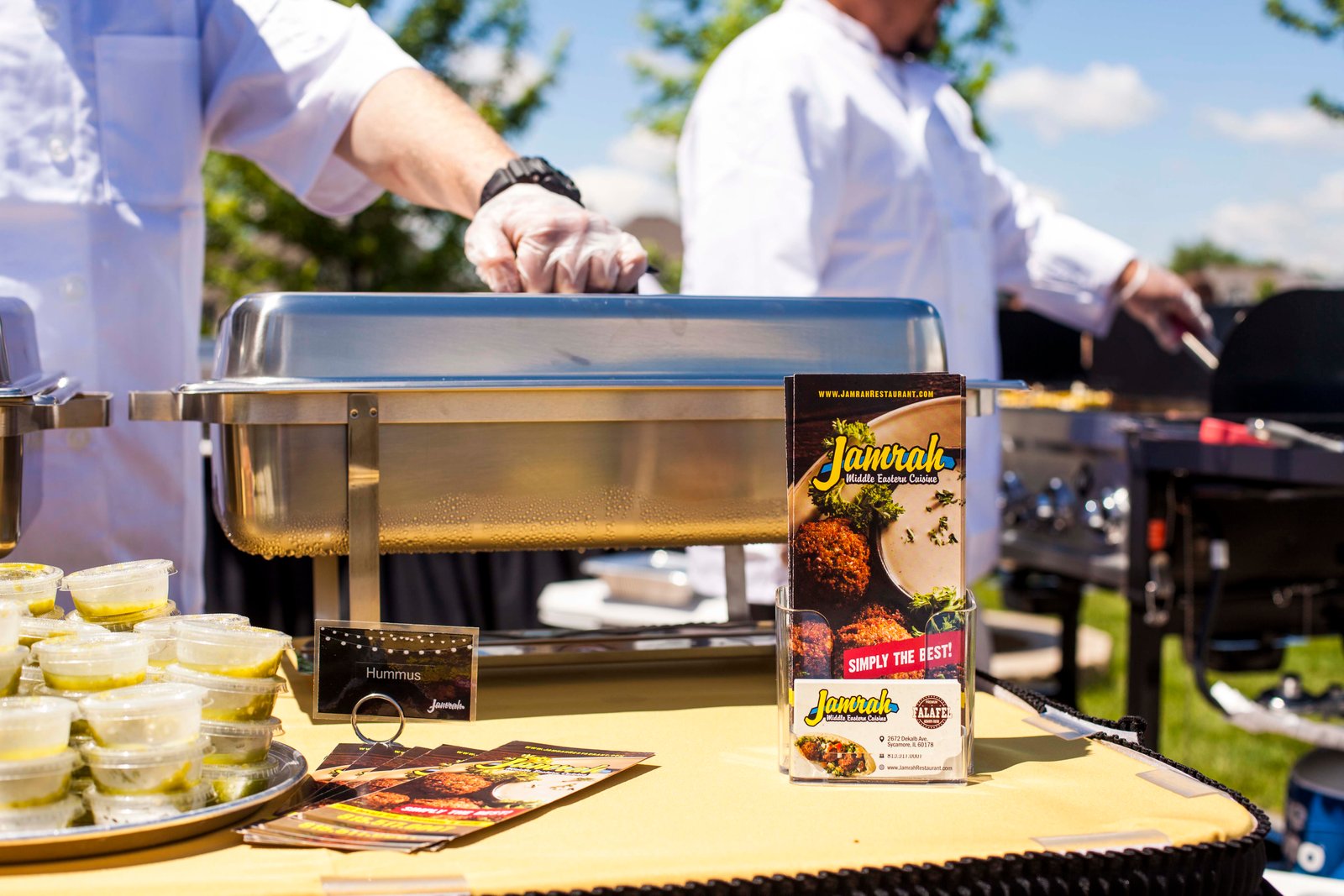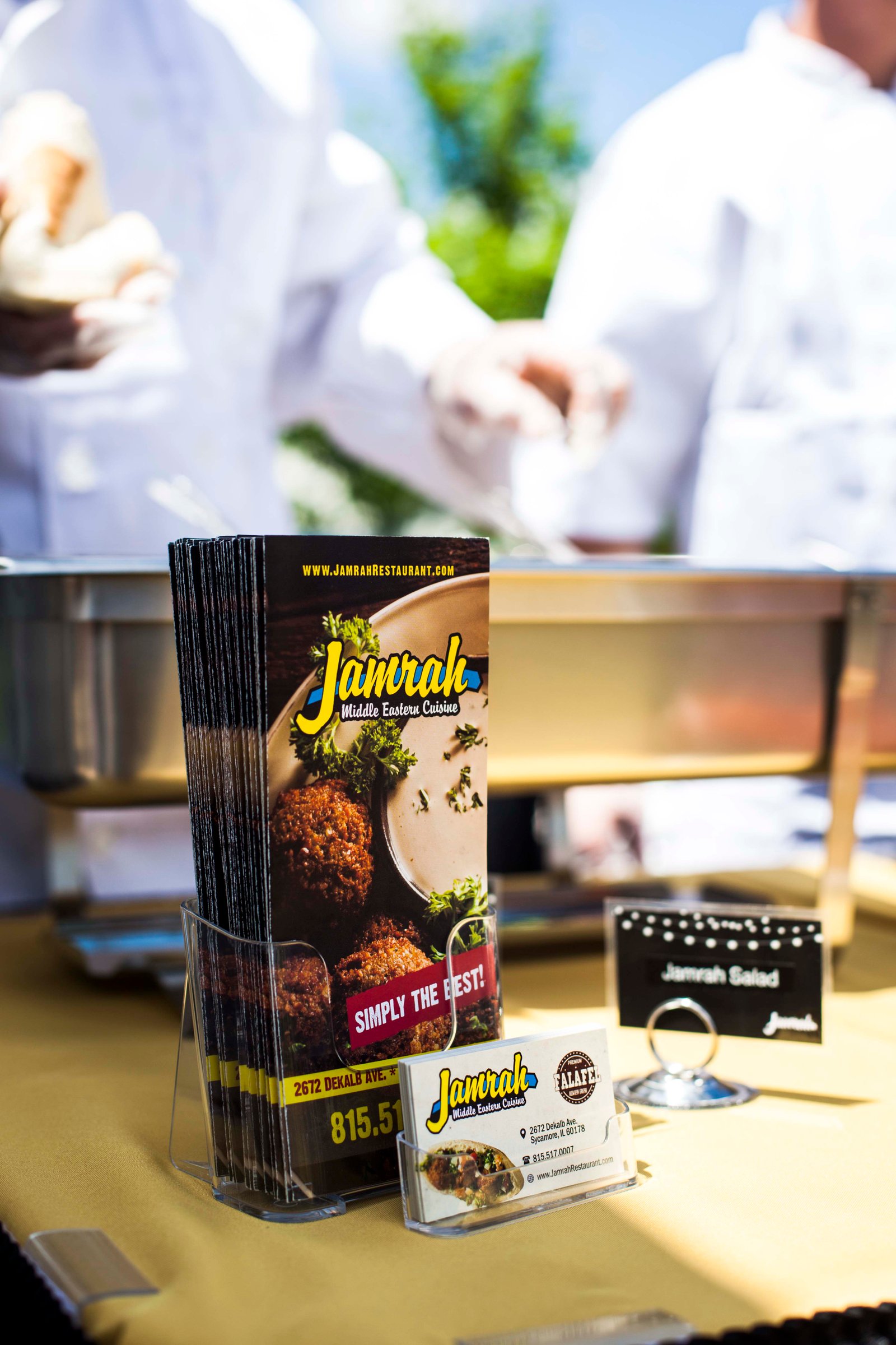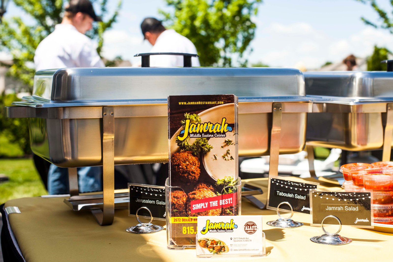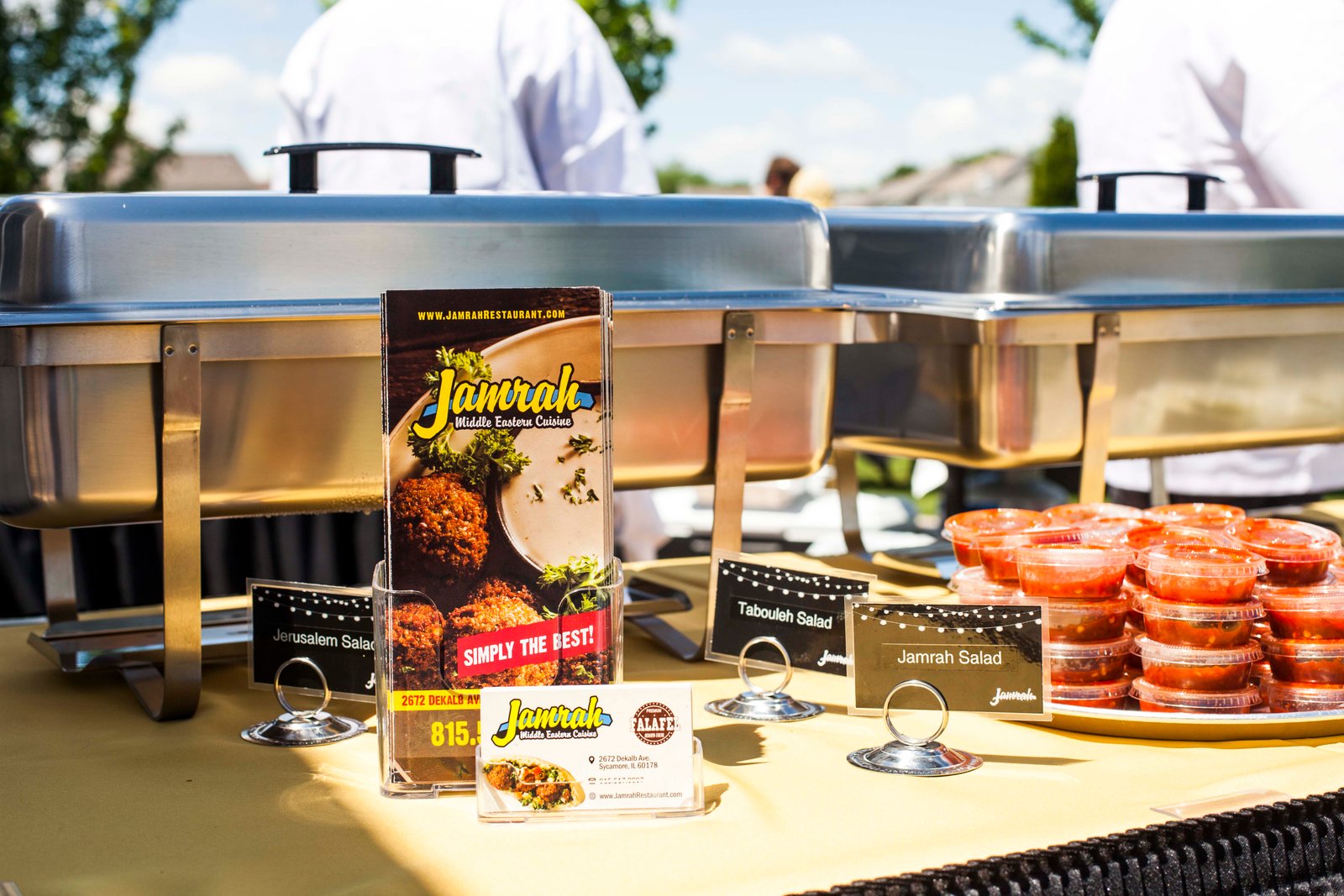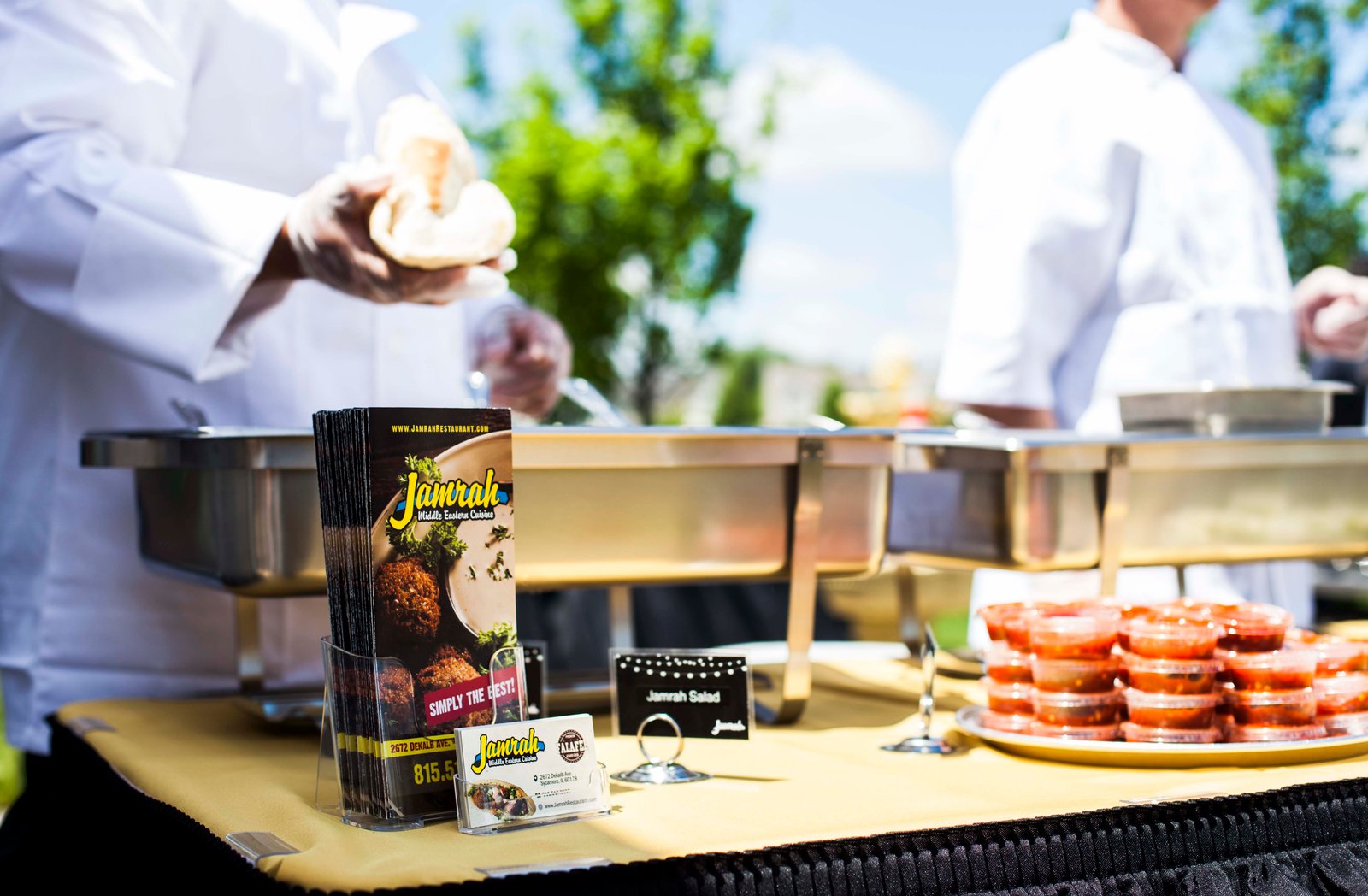 Jamrah Middle Eastern Cuisine Catering can provide you with all your catering needs from special events like, corporate luncheon, corporate parties/deliveries, pickups, luncheons, graduations, weddings, and holiday parties. Jamrah Middle Eastern Cuisine catering events offers a wide array of items from our delicious mediterranean food, to tables, chairs, and chinaware, lighting, linen, tents and decorative other pieces. We offer cutting edge and vibrant atmosphere for every event. We serve all of Dekalb, Sycamore and other cities. Please call us to arrange your next great event.